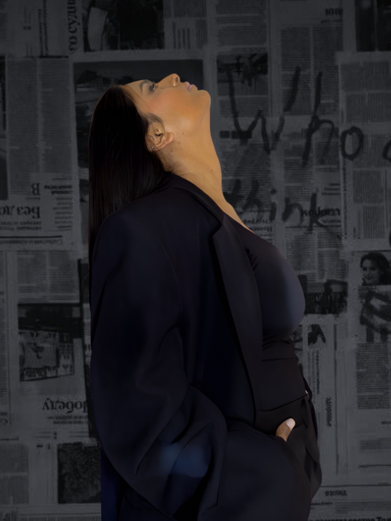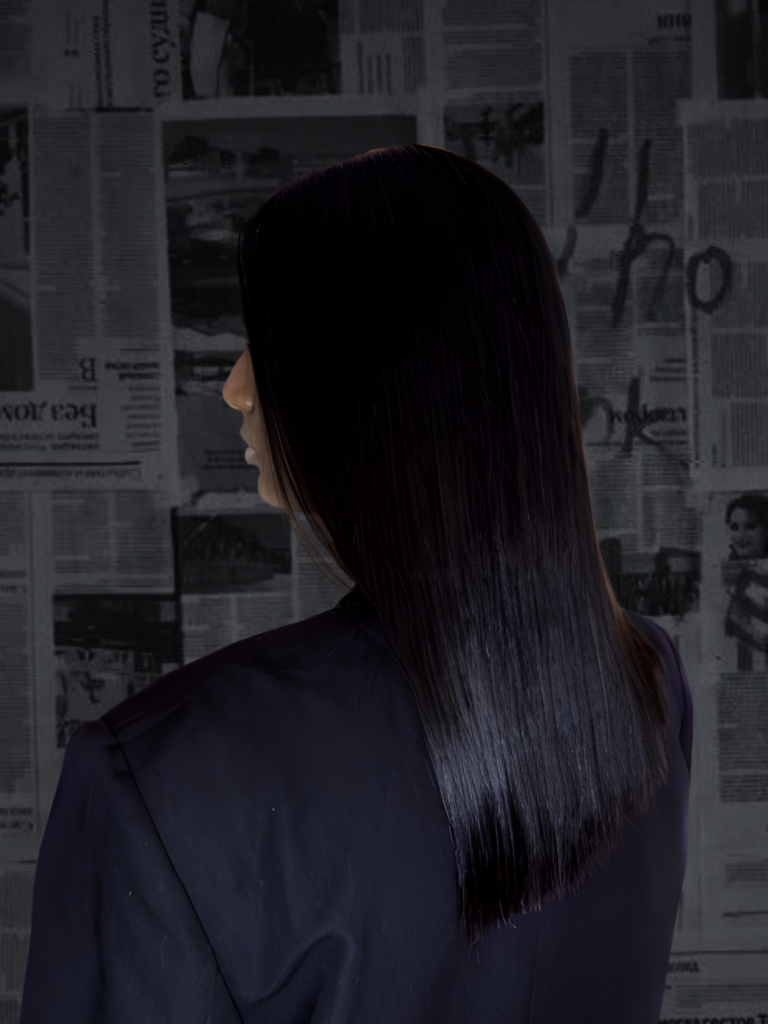 La realitat pesa massa. La ment es resisteix a acceptar el que ha perdut. Tot es torna fosc, rígid i silenciós. La negació es una cuirassa que en protegeix… però també ens immobilitza. El cabell negre i sòlid reflexteix el reubig a la veritat i l’intent de mantenir el control quan tot s’esfondra dins.